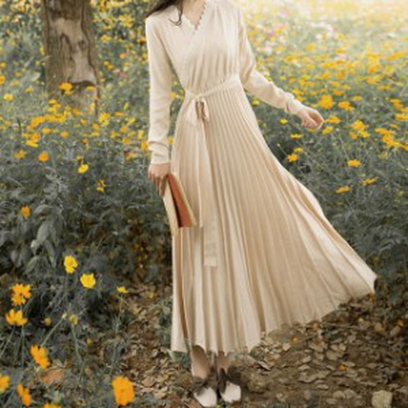 マフラーとセット ニットワンピース ワンピース レディース 秋 冬 ニット ロングワンピース 長袖 ベージュ Vネック きれいめ カジュアル Evergreen